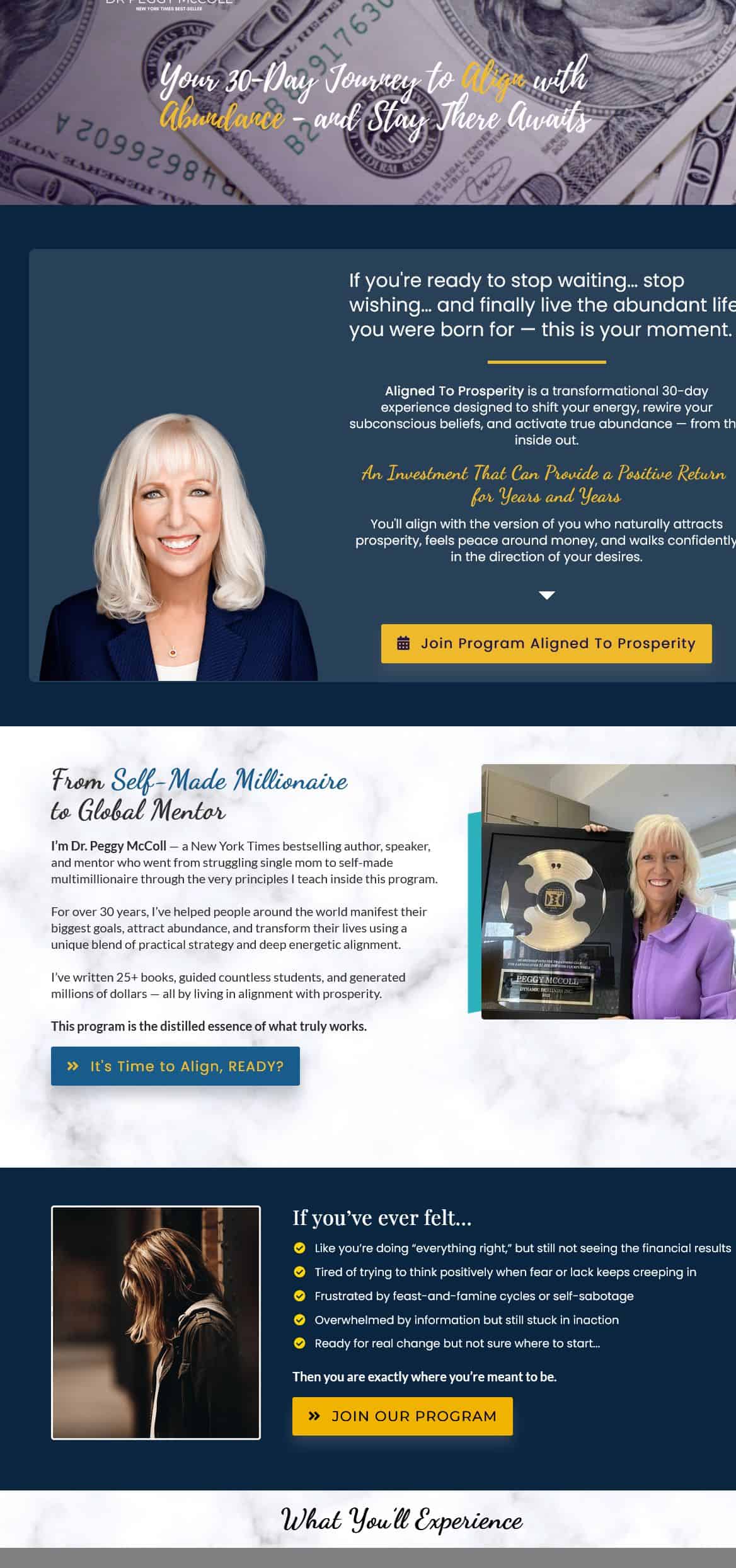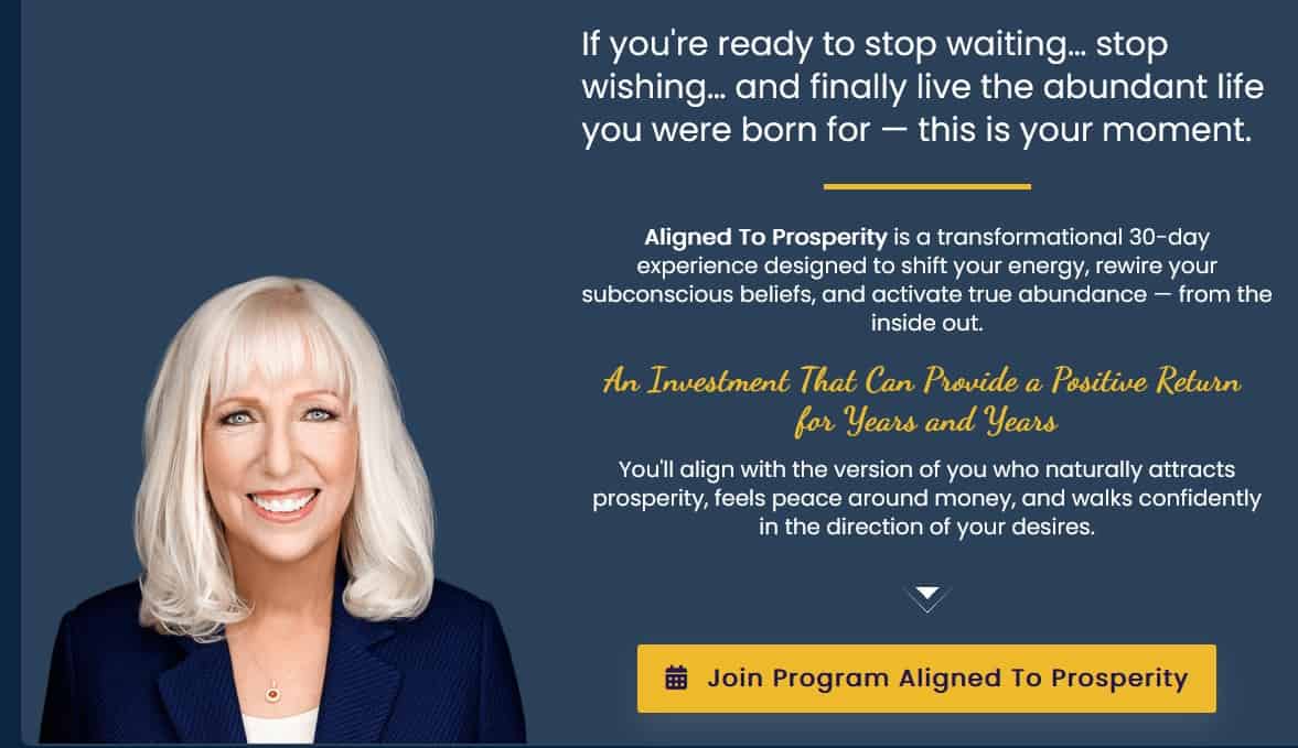 Aligned To Prosperity is a transformational 30-day experience created by Dr. Peggy McColl, a New York Times bestselling author of over 25 books and founder of Dynamic Destinies, Inc. The program uses her proprietary Power Life Script method to shift your energy, rewire subconscious beliefs around money, and activate lasting abundance through 4 weekly live classes, daily guided practices, and group coaching calls.