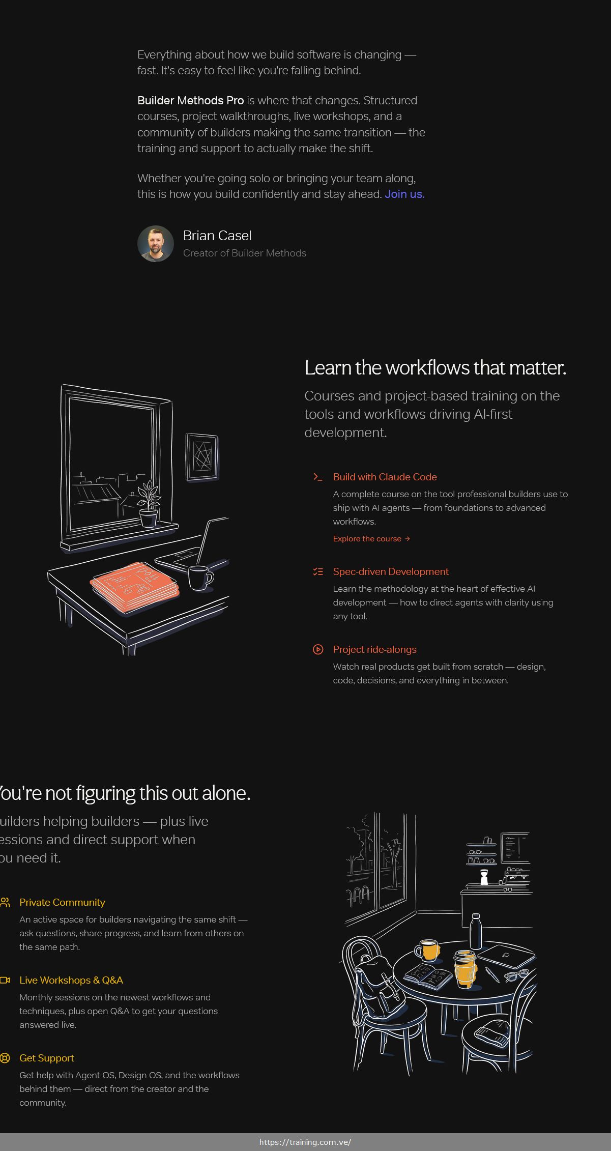 Builder Methods Pro is a video training membership created by Brian Casel — a bootstrapped SaaS founder with 20+ years of building software who has shipped multiple products including Restaurant Engine (sold 2015), Audience Ops (sold 2021), and Clarityflow. The program teaches AI-first development workflows through structured courses, live project walkthroughs, and recorded workshops, with the core course focusing on Claude Code as the professional tool for shipping software with AI agents. The membership includes 39 video lessons totaling over 22 hours of content, organized into the Build with Claude Code course, Spec-Driven Development training, live workshop recordings, and project ride-alongs.