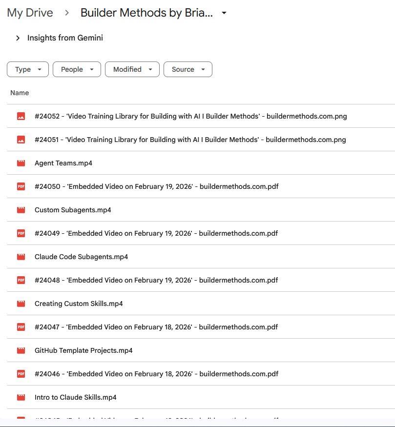• Real product build sessions, not demo apps — The project ride-alongs in Builder Methods are sessions from Brian building actual features of his real video library platform: a PDF invoice generator, member profiles, a video series system, and a marketing site template. These show the real friction, decisions, and debugging that happen in production AI development, not a clean demo-ware walkthrough.