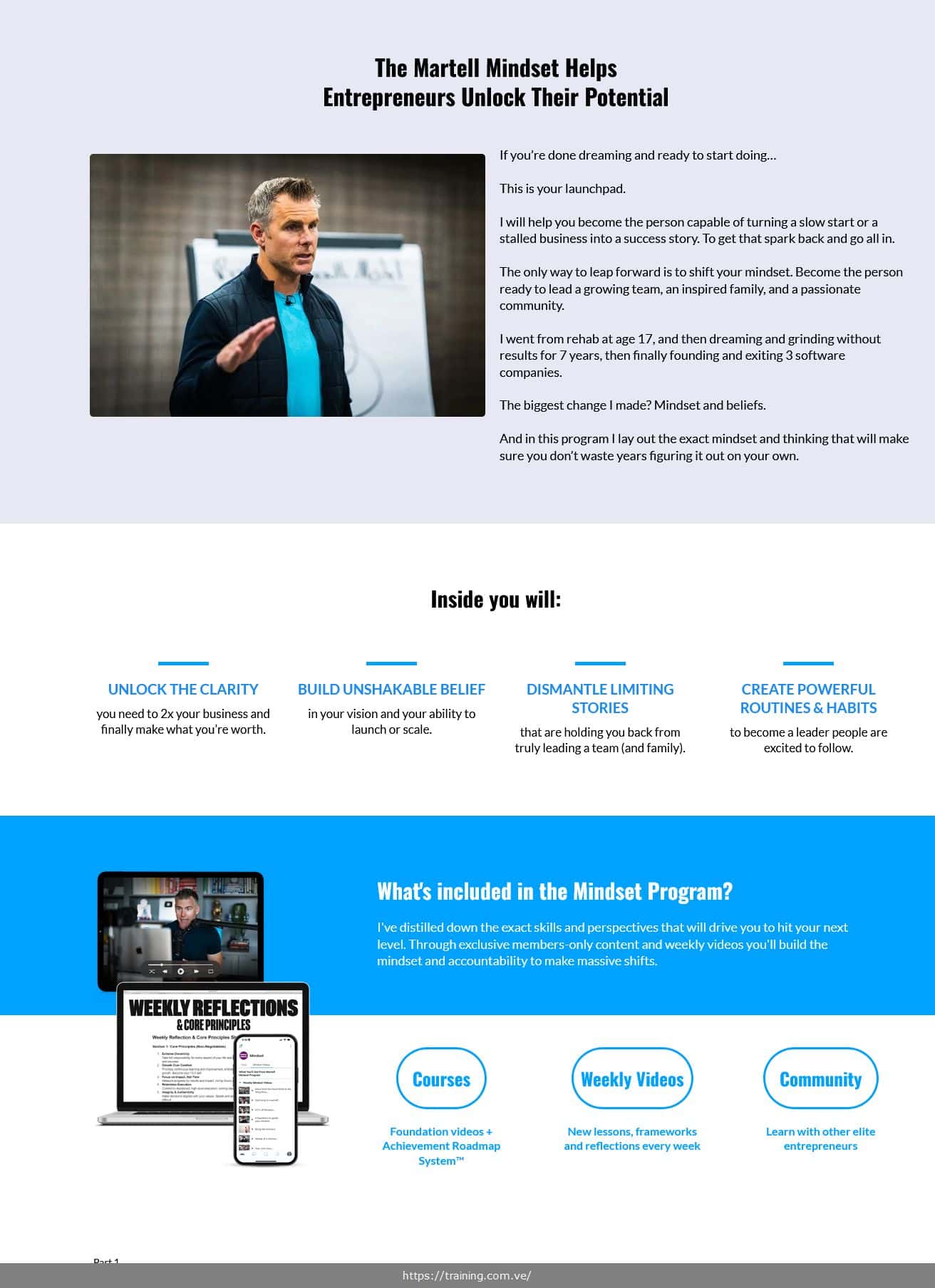 ✅ Core Mindset Teaching Library (50+ standalone lessons): Video lessons covering Martell's specific frameworks: Antifragility, Sensory Acuity, The Dualities, CSI to Reprogram Your Mind, the 4 C's of Miracles, Pre-Loaded Year, and dozens more — each a focused teaching on one principle.