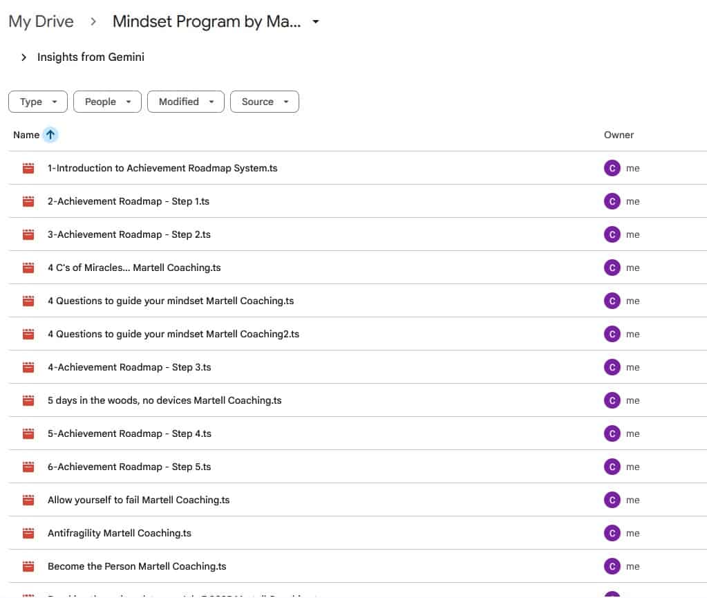 • Live call recordings inside the content library — The 12 monthly Live Mindset Calls from May through November 2025 are included as video files, not promised as a future benefit. Each runs approximately an hour, giving access to real-time coaching dynamics — member questions, Martell's live application of principles to real business situations — that standalone pre-recorded courses don't replicate.