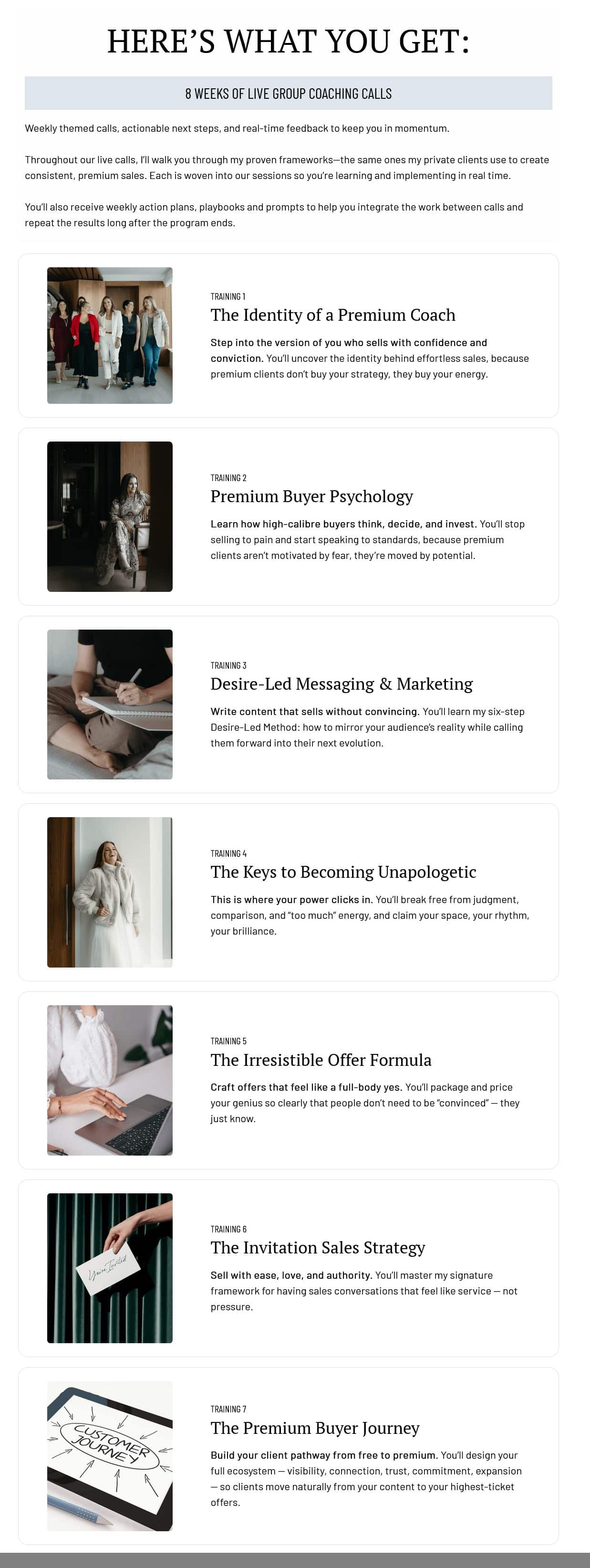 ✅ 7 Core Training Sessions: Comprehensive video modules covering premium buyer psychology, desire-led messaging, unapologetic positioning, premium offer design, and the complete sales method (9h 51m 35s total)