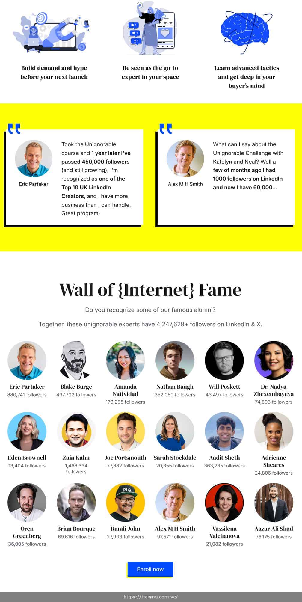 • Built by a buyer psychology researcher, not a content creator — Katelyn Bourgoin's background is not content creation — it's buyer psychology research. Her Why We Buy newsletter, Customer Camp training programs, and the Trigger Technique she developed for customer interviews are all grounded in JTBD theory and persuasion science. This means Unignorable approaches personal branding through the lens of “why people buy” rather than “what gets views,” and the curriculum reflects that: the JTBD framework is integrated into the personal brand architecture, not treated as an afterthought.