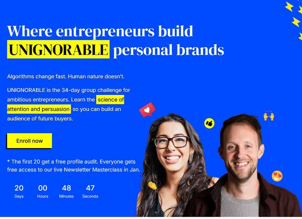 Unignorable was created by Katelyn Bourgoin, founder of the Why We Buy newsletter (63,000+ subscribers) and CEO of Customer Camp, and Neal O'Grady, co-founder of Demand Curve. Katelyn is a 4x founder with a background in buyer psychology research; Forbes has called her an “influential entrepreneur” and she has been named one of the top 20 wonder women in SaaS marketing and growth. Together, they ran five live cohorts of the Unignorable Challenge before converting the program to a self-paced course.